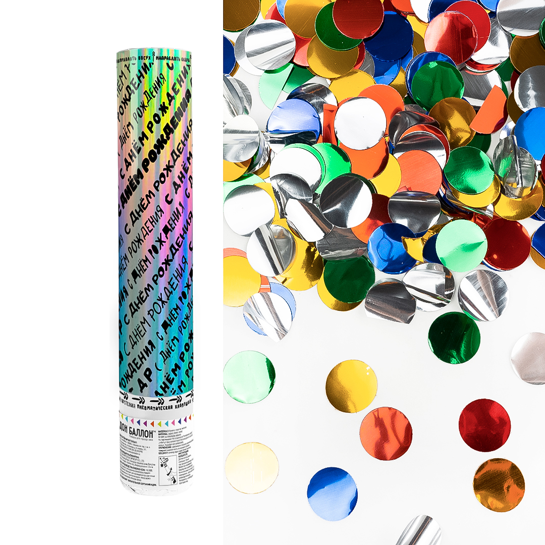 Пневмохлопушка (12/30 см), С Днем Рождения, Круги фольга, Ассорти, 1 шт.