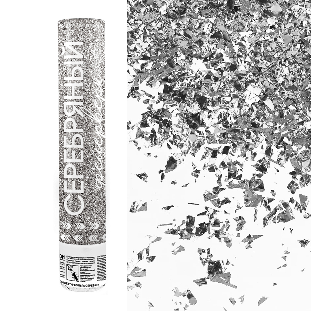 Пневмохлопушка (12/30 см), Искрящийся фейерверк, Конфетти дробленые, Серебро, 1 шт.