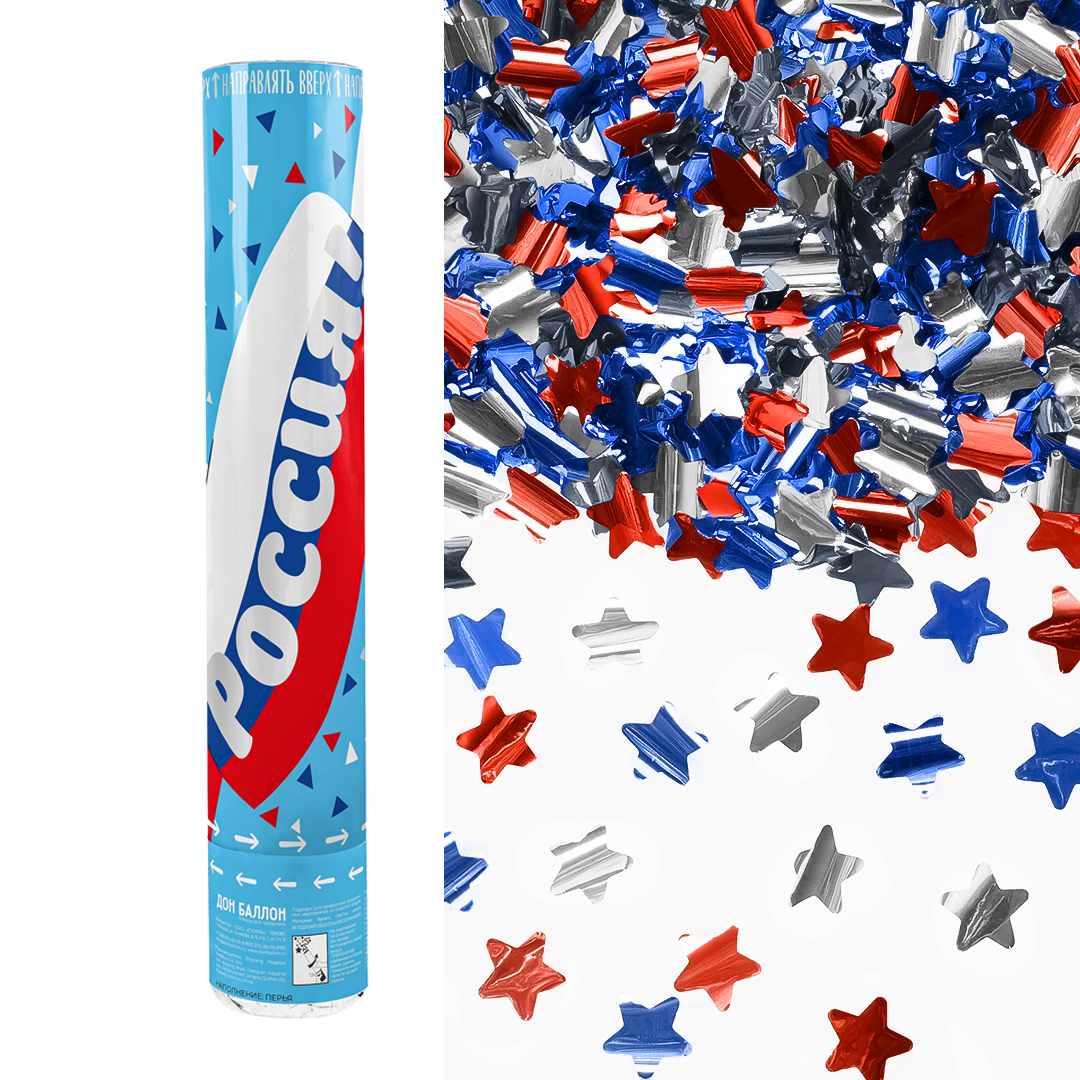 Пневмохлопушка (12/30 см), Россия, Звезды фольга, Триколор, 1 шт.