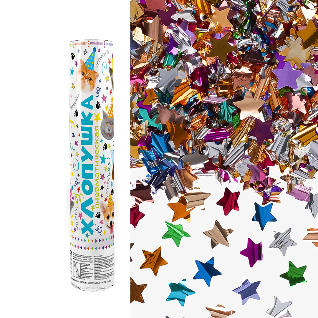 Пневмохлопушка (12/30 см), Котики и Собачки, Звезды фольга, Ассорти, 1 шт.